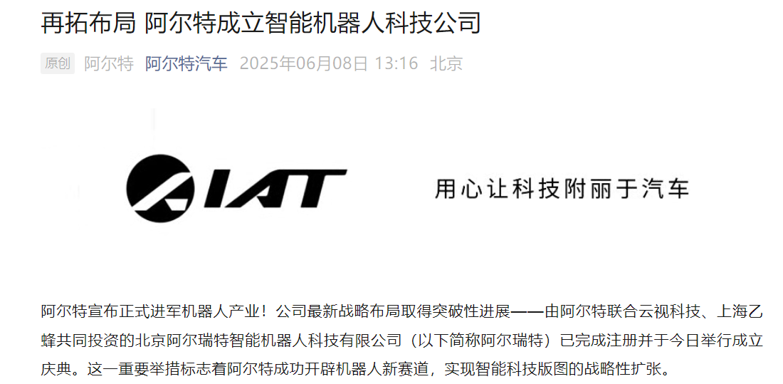 每经AI快讯,阿尔特宣布正式进军机器人产业!公司最新战略布局取得突破性进展——由阿尔特联合云视科技、上海乙蜂共同投资的北京阿尔瑞特智能机器人科技有限公司已完成注册并于今日举行成立庆典。这一重要举措标志着阿尔特成功开辟机器人新赛道,实现智能科技版图的战略性扩张。